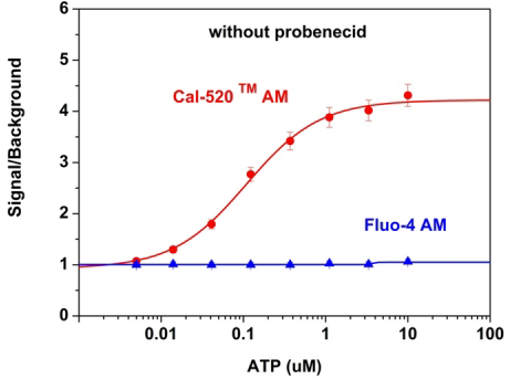 Activity is initiated once the probe enters a live cell and only after intracellular esterases remove the AM ester functional groups. Once activated, probes detect calcium through chelation and respond by generating a fluorescence signal relative to the concentration of calcium. Indicators such as Fluo-8®, AM (Cat No. 21080), Cal-520®, AM (Cat No. 21131) and Calbryte™ 520, AM (Cat No. 20653) have been extensively used in calcium imaging, calcium flux assays and cell-based high throughput screening (HTS) assays for drug discovery. Calcium indicators are compatible with use in flow cytometry, fluorescence microscopy, and the fluorescence microplate platform. Besides offering fluorescent and luminescent calcium indicators, we also provide several non-fluorescent calcium signaling molecules and chelators for measuring and manipulating intracellular and extracellular calcium.