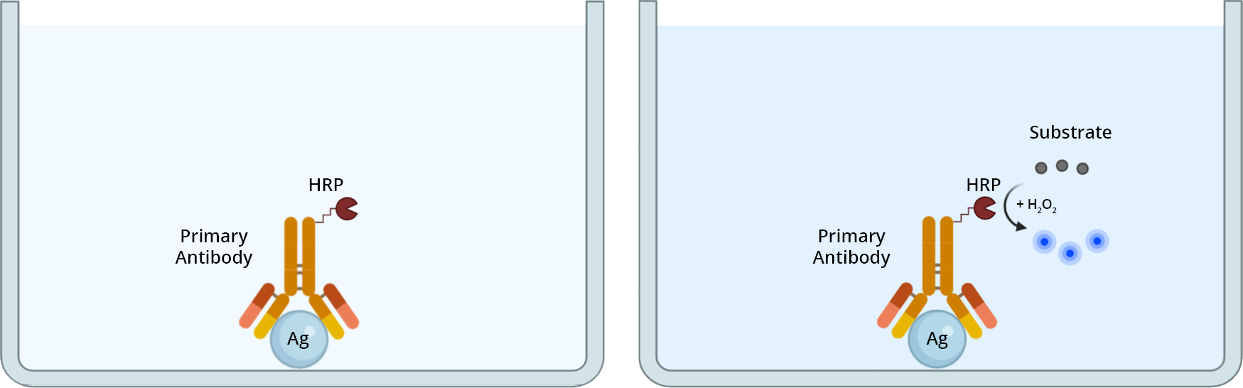 The method for detecting a primary antibody-antigen complex in an ELISA, can be either direct or indirect (Figure 1). In direct detection methods, a single primary antibody conjugated to a reporter enzyme (e.g. HRP or AP) is used in a single-step procedure to directly detect a target antigen. With indirect detection, a dual antibody system is used sequentially to detect the target of interest. First, the sample is incubated with an unlabeled primary antibody directed against the target antigen. Then, an enzyme-labeled secondary antibody specific for the primary antibody is used to detect its presence, and thus the target antigen. If using a biotinylated primary antibody to detect the antigen, then use an enzyme-labeled streptavidin conjugate as your secondary detection reagent.