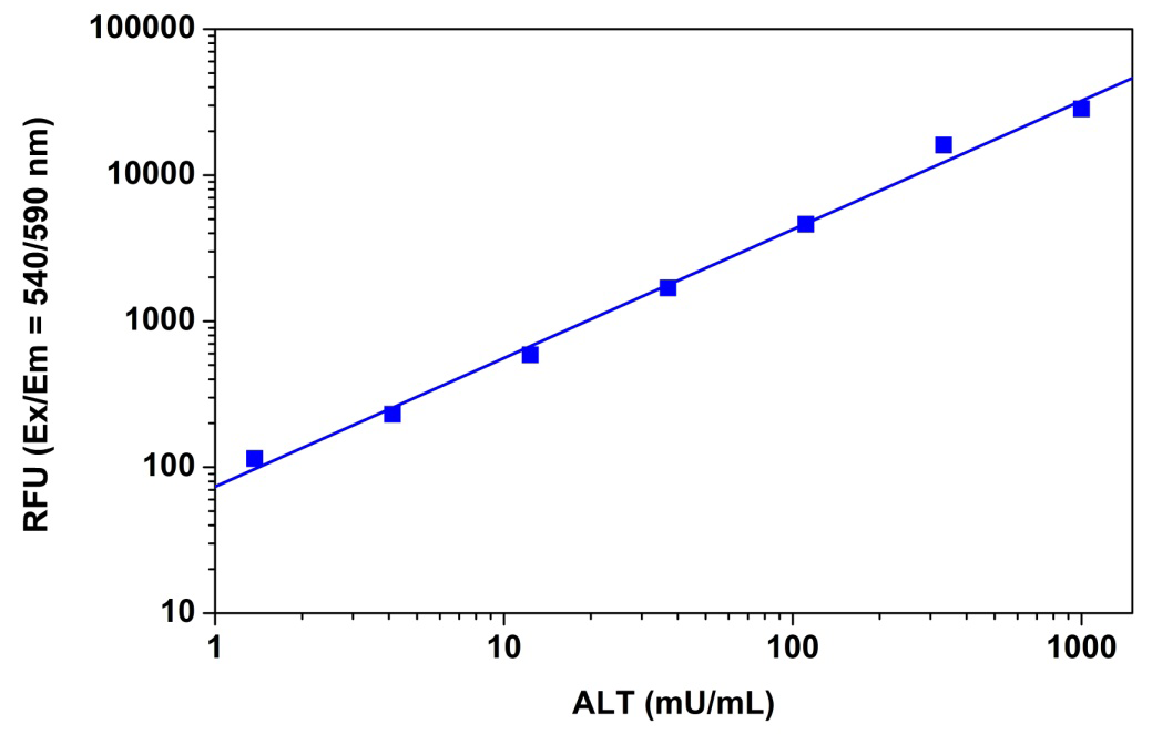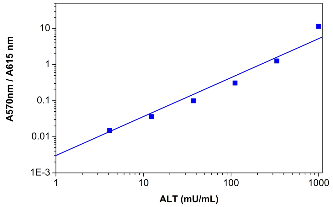 Alanine aminotransferase (ALT), also called serum glutamate pyruvate transaminase (GPT), catalyzes the reversible transfer of an ?-amino group between alanine and glutamate, and is an important enzyme in amino acid metabolism. ALT is mainly found in the liver as well as in the heart, muscle, and kidneys but at much lower levels. In healthy subjects, serum ALT levels are relatively low. However, when cells are damaged, such as during acute and chronic hepatitis, obstructive jaundice, carcinoma of liver, myocardial infarction, ALT leaks into the blood stream causing a significant increase in serum ALT levels. Therefore, determination of serum ALT levels has great clinical and diagnostic significance.
