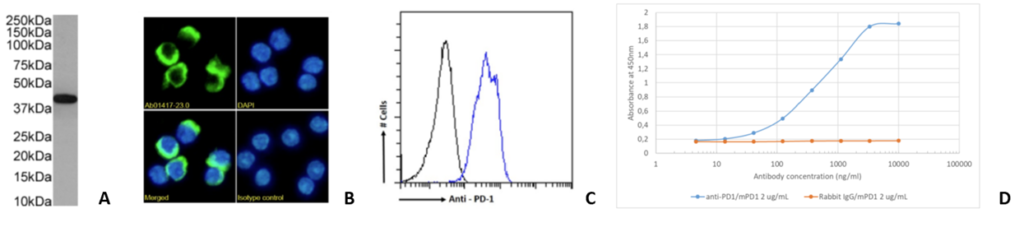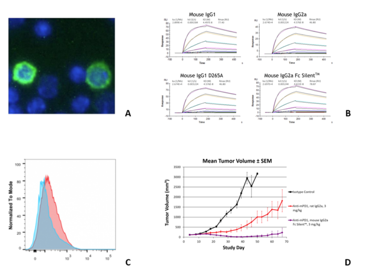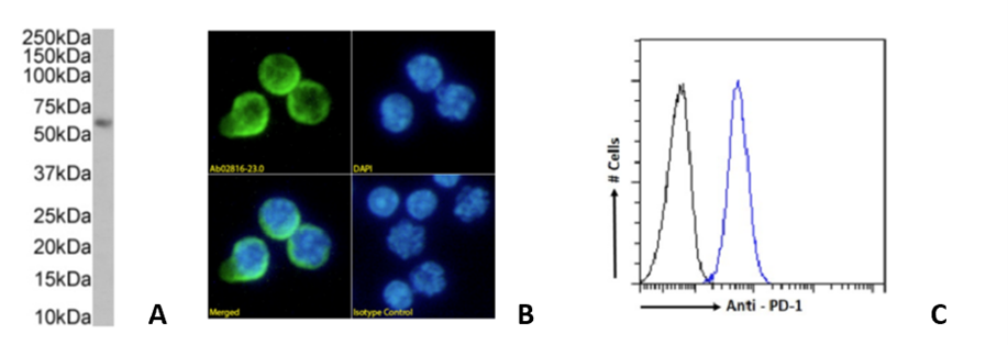 RMP1-14 and 29F.1A12 are originally rat IgG2a, while J43 is hamster IgG. The RMP1-14 clone is an in vivo blocking anti-PD-1 antibody. Further, our Fc Silent™ RMP-14 clone has been shown to have stronger anti-tumor activity than the original non-engineered rat antibody. The 29F.1A12 and J43 clones are in vivo PD-1 blocking and in vitro PD-1 neutralizing antibodies. Moreover, RMP1-14, 29F.1A12 and J43 are able to block the binding of PD-1 to PD-L1 and PD-L2. Figure 1 shows immunofluorescence, SPR, flow cytometry and in vivo analysis for clone RMP1-14 (Ab00813). Figure 2 shows Western blot, immunofluorescence, and flow cytometry analysis for clone J43 (Ab01417) and Figure 3 shows Western blot, immunofluorescence, and flow cytometry analysis for clone 29F.1A12 (Ab02816). The antigen, together with the reported applications and formats currently available on the website, are depicted in the table below.
