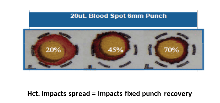 Other factors that render NBS blood sampling cards qualitative include the hematocrit effect, whereby the proportion of red blood cells in the blood influences blood viscosity and impedes homogenous spreading of blood throughout the card, as well as documented variation in analyte distribution, which was recently discussed in relation to PKU monitoring by Hogg et al., 2023 (2).