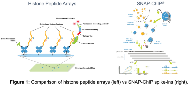The use of defined nucleosome substrates in SNAP-ChIP is essential for accurate testing of histone PTM antibody activity. SNAP-ChIP spike-ins are also an invaluable tool for monitoring experimental variation, and provide a STOP / GO checkpoint prior to sequencing.