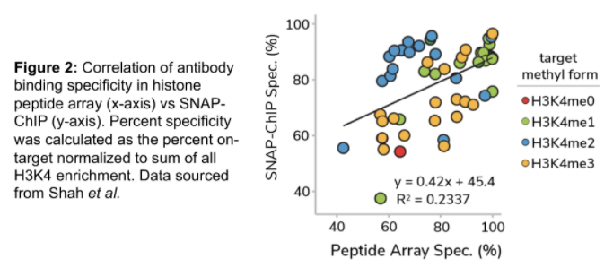 Remarkably, there was no correlation between antibody performance in SNAP-ChIP and histone peptide arrays (Figure 2). In fact, binding to histone peptides failed to predict performance of antibodies in ChIP-seq experiments!