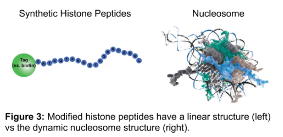 This shocking result can be most easily explained through analysis of histone peptide and nucleosome substrates. The linear epitopes represented in modified histone peptides are substantially different from the complex nucleosome structure an antibody actually interacts with in ChIP applications (Figure 3).