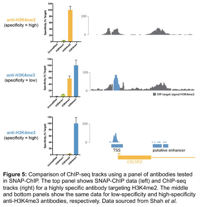 Comparison of ChIP tracks (Figure 5) revealed that use of a low specificity H3K4me3 antibody results in significant contaminating signal from H3K4me2.