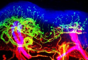 Epidermal basement membrane labeled with mouse anti-collagen IV + donkey anti-mouse-Cy2 (715-225-150, green), keratinocytes and endothelium labeled with biotinylated Ulex+Streptavidin-Cy5 (016-170-084, blue) and nerve fibers labeled with rabbit anti-PGP9.5 + donkey anti-rabbit-Cy2 (711-225-152, green)