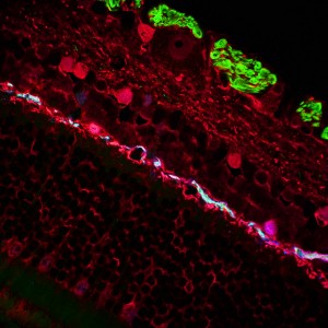 Cy3 donkey anti-rabbit IgG (711-165-152 – red) and Cy5 donkey anti-mouse IgG (715-175-150 – blue) and Cy2 streptavidin (016-220-084 – green).