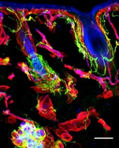 Rabbit anti-PGP9.5 + Cy™2 Donkey anti-Rabbit (711-225-152 green). Basement membranes, Mouse anti-collagen IV + Cy™3 Donkey anti-Mouse (711-165-152 red). Keratinocytes and endothelium, Ulex-biotin+ Cy™5 Streptavidin (016-170-084 blue). Images McAdams et al