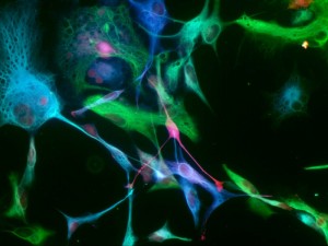 Cultured cells were immunocytochemically stained for GFAP (blue AMCA), Doublecortin (red Cy2), and Nestin (green RRX).