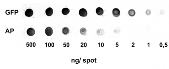0.5-500 ng/spot of GFP-Strep-tagII (28 kDa) or alkaline phosphatase C-terminally tagged with Strep-tag®II (monomer 48.5 kDa) were spotted onto a membrane. Detection occurred with Strep-Tactin® AP.