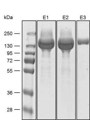 The coding sequence of the customer protein was cloned into pDSG-IBA102 leading to a recombinant protein with C-terminal Twin-Strep-tag® and BM40 secretion signal. 1050 ml of MEXi-TM was inoculated with MEXi 293E cells. Subsequently, plasmid DNA was added followed by addition of 25 kDa linear PEI. The cells were incubated for 4 hours in MEXi-TM medium at 37 °C, 5% CO2, and 125 rpm in an orbital shaking incubator. Cells were diluted to 7.5 x 105 cells/ml by addition of one volume MEXi-CM and kept at 37 °C for 7 days. Afterwards, cells were pelleted and the supernatant containing the customer protein was harvested. The customer protein was finally purified using Strep-Tactin®XT Superflow®. The figure shows the elution fractions (E1-E3). A dilution of 1:10 was prepared for E1 and E2 for SDS-PAGE analysis.