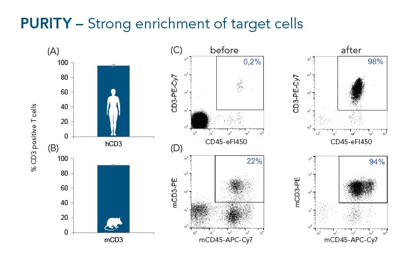 CD3+ cells were isolated from buffy coats (A, n=10) or murine splenocytes (B, n=7) using the Fab-TACS® approach for affinity chromatographic cell isolation. Data are displayed as mean ± SEM. Cells were analyzed by flow cytometry. Representative FACS plots before and after enrichment are shown in C (human) and D (mouse). Single cells were gated according to scatter properties and dead cells excluded by DAPI staining. Isolated human CD3+ T cell had an average purity of 96% and isolated murine CD3+ T cells an average purity of 91%.