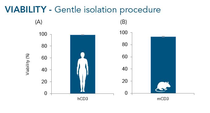CD3+ T cells were isolated from buffy coats or murine splenocytes using CD3 Fab-Streps and Strep-Tactin-TACS® Agarose columns according to the affinity chromatographic Fab-TACS® approach. Purity, yield and viability were evaluated.