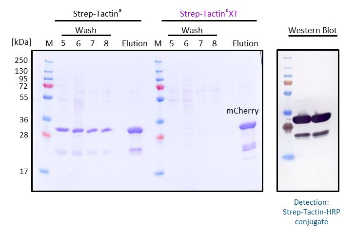 An advantage of Strep-Tactin®XT compared to Strep-Tactin® is that it allows intensive washing without loss in protein yield. To illustrate this, mCherry-Twin-Strep-tag from E. coli supernatant was purified with a gravity flow column either containing 1 ml Strep-Tactin® Superflow® or Strep-Tactin®XT Superflow®. During purification, the columns were washed with 8 column volumes of 1x Buffer W to reach a constant absorption ratio at A260/280 nm. Then, the target protein was eluted with 50 mM biotin. Samples of the last wash fractions (wash 5-8) and the elution fraction were analyzed by SDS-PAGE. In comparison to Strep-Tactin® Superflow®, Strep-Tactin®XT Superflow allows intensive washing without loss of protein yield. The high affinity (pM range) between Strep-Tactin®XT and Twin-Strep-tag® leads to a tighter binding and prevents a premature elution of the target protein during the wash steps. The elution fractions were further analyzed by Western Blot and detected with Strep-Tactin®HRP, showing that the further bands are alternative variants of mCherry-Twin-Strep-tag.