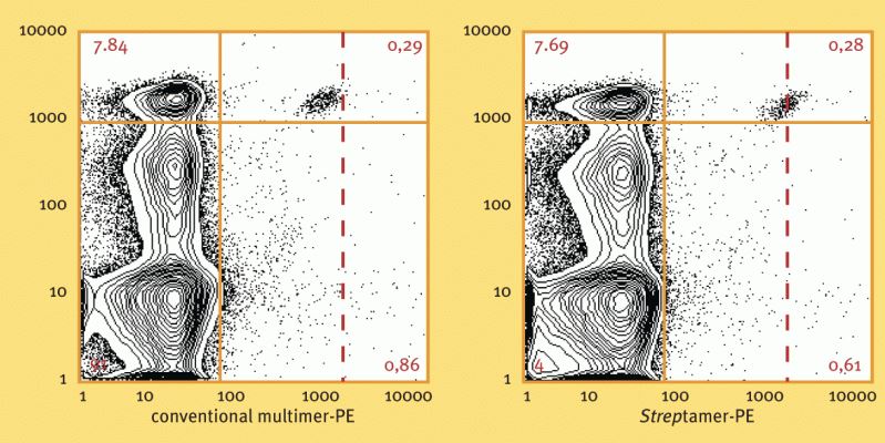 Ex vivo staining of CMV-specific CD8+ T cells with HLA-A*0201 CMV pp65495-503 Streptamer® (right diagram) or conventional multimers (left diagram). Staining was performed from a CMV positive individual at 4°C. Staining with MHC I Streptamer® resulted in improved staining intensity.