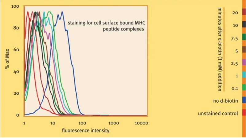 Antigen-specific cells were visualized with Strep-Tactin® PE coupled to MHC I-Strep H2-Kd specific for LLO91-99 . After addition of 1 mM d-biotin, subsequent dissociation of monomerized MHC molecules was monitored at different time points as indicated. 20 minutes after biotin addition, staining reagents were largely removed from the cells. Staining and dissociation were performed at 4 °C.