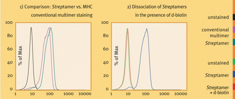 Staining of Her2/neu-specifc CD8+ T cells (kindly provided by H. Bernhard, TU Munich) with HLA-A*0201/Her2/neu369-377 Streptamers® as compared to conventional multimers (left diagram). Complete dissociation of Streptamer® staining reagents from the cells is shown after a brief incubation (30 min) in the presence of 1 mM d-biotin (right diagram). Antigen-specific T cells were visualized with Strep-Tactin® PE coupled to MHC I-Strep HLA-A*0201 specific for Her2/neu369-377. Staining and dissociation were performed at 4 °C.