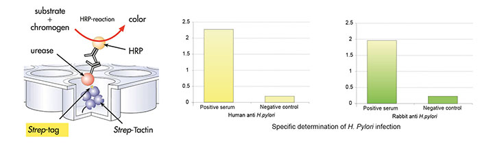 Strep-Tactin® coated microplate was incubated with recombinant H. pylori urease tagged with Strep-tag® II, followed by three washing cycles. Afterwards, the microplate was incubated with human sera followed by three washing cycles. Third incubation occurred with rabbit anti-human lgG conjugated to horseradish peroxidase (HRP), followed by 3 washing cycles. Amount of bound antibodies from human sera was determined by colorimetric reaction of HRP.