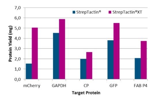 Five different proteins were purified with Strep-Tactin® Superflow® and Strep-Tactin®XT Superflow® to compare the yield with both rein types. Here, we found that Strep-Tactin®XT Superflow® allows the purification of on average a 2-fold higher protein yield than Strep-Tactin® Superflow®.