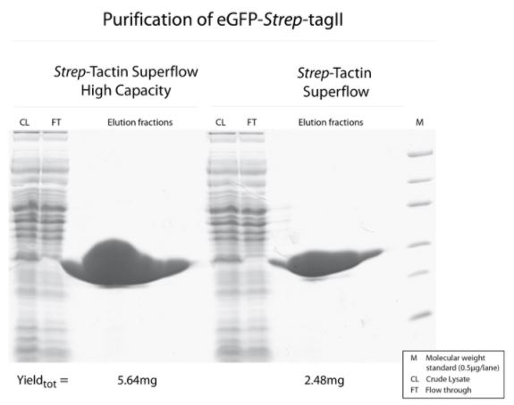 Cell lysate contaning GFP-Twin-Strep-tag was split and either purified with Strep-Tactin® Superflow® or Strep-Tactin® Superflow® high capacity.