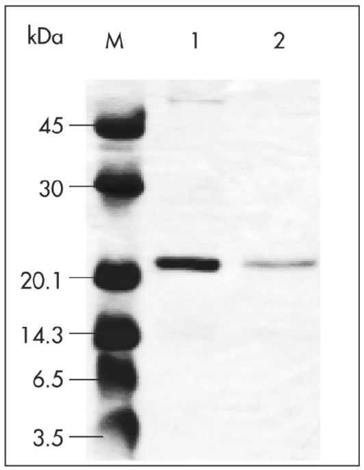 Coding sequences of virus-like particles (VLPs, 4.8 MDa) were cloned into pASK-IBA7 to obtain proteins localized to the cytoplasm and N-terminally tagged with Strep-tag®II. The plasmid was transformed into E. coli and the cell culture (1 l) was induced at OD600 of 0.6 by addition of anhydrotetracycline (AHT). Protein expression was performed at 37 °C for 3 h at 200 rpm. Afterwards, cells were harvested, resuspended with 20 ml 1x Buffer W (100 mM Tris-Cl, 150 mM NaCl, 1 mM EDTA), and sonicated. The insoluble material was pelleted, and the lysate was applied to a Strep-Tactin® Superflow® cartridge (1 ml/min flow rate). After washing, the target protein was eluted with 2.5 mM desthiobiotin. Purification results were analyzed by SDS-PAGE. Marker (M) and two different elution fractions of VLPs fused to Strep-tag®II (lane 1 and 2) are shown.