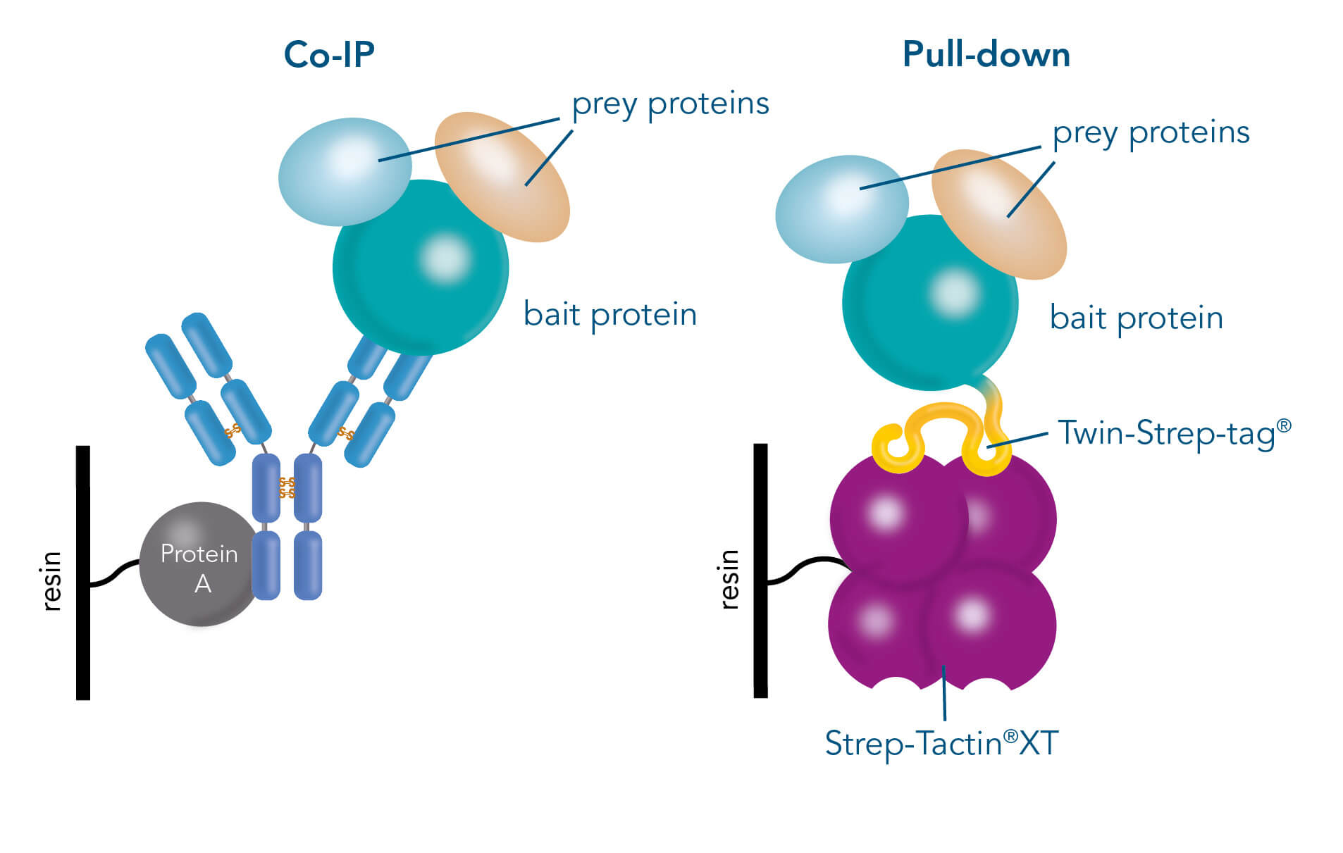 While IP is used for capturing one specific target from a mixture, Co-IP and pull-down assays not only focus on single proteins but also on molecules which are attached to the target protein. Identifying the cellular interaction partners of a protein of interest and determining the biological pathways involved is a necessary preliminary work to gain deeper insights into a target’s structure and function. When it comes to the investigation, IP, Co-IP and pull-down assays have become invaluable tools, which are built upon the affinity-based immobilization of a “bait” protein on a solid support, mostly magnetic or agarose beads.