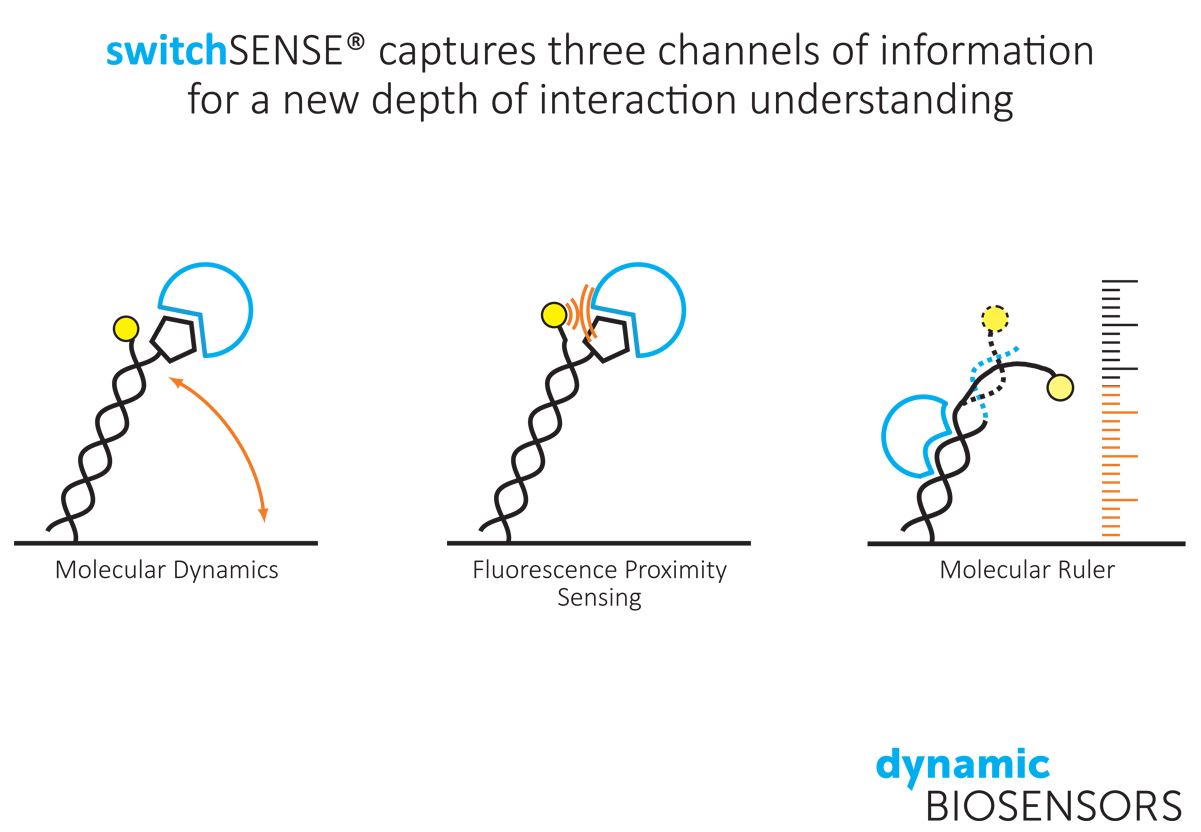 The switchSENSE® technology of Dynamic Biosensors utilizes a novel electro-switchable biosurface to provide researchers and commercial laboratories the ability to characterize interactions between molecules in real-time. This technology is unlike existing methodologies in that it combines high sensitivity kinetics with structural information on size, shape and conformation providing a new depth and understanding of the interaction.