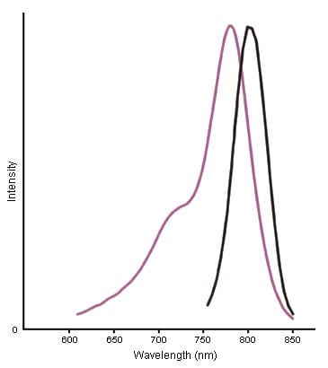| Figure 1. Excitation and emission spectra of Alexa Fluor® 680 (left) and Alexa Fluor® 790 (right) conjugated secondary antibodies. All peaks were normalised. Spectra were obtained with an M-Series spectrofluorometer from Photon Technology International, Inc. and an Ultraspec 1100 pro from Amersham Biosciences. | |