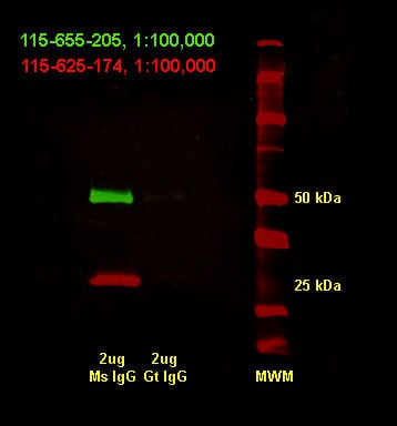 | Figure 2. Double immunofluorescence staining on a Western blot using Alexa Fluor® 680 far-red dye and Alexa Fluor® 790 infrared dye. Mouse IgG and goat IgG were reduced and denatured with ß-mercaptoethanol and SDS. The heavy and light chains were separated by electrophoresis in SDS-PAGE, transferred to nitrocellulose, and double labelled with a 1:100,000 dilution of Alexa Fluor® 790-goat anti-mouse IgG, Fc? Subclass 1 specific (min X Hu, Bov, Rb Sr Prot, 115-655-205)(green) to detect heavy chains and a 1:100,000 dilution of Alex Fluor® 680-goat anti-mouse IgG, light chain specific (min X Bov, Gt, Hrs, Hu, Rb, Rat, Shp Ig, 115-625-174)(red) to detect light chains. Fluorescence was imaged in a LiCor Odyssey imager. Goat IgG was used as a background control. Note the faint bands of goat IgG heavy and light chains attesting to the extreme brightness of the dyes even at a dilution of 1:100000. |