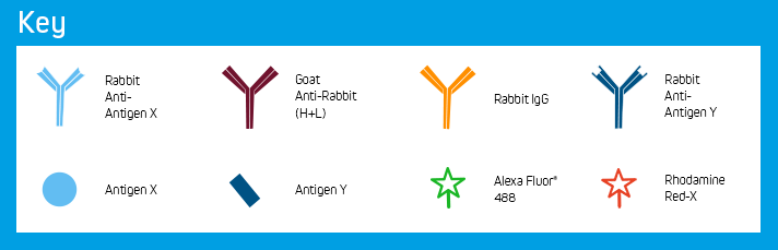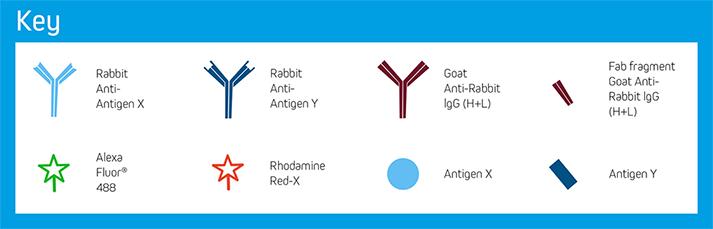 In contrast, divalent antibodies (whole IgG and F(ab’)2 fragments) have two antigen binding sites. After labeling the first primary antibody, some antigen binding sites on the first secondary antibody may remain open which could capture the second primary antibody introduced in a subsequent step. Consequently, it will appear as overlapping labeling, even though there may not be overlapping antigens. Therefore, divalent antibodies should not be used for blocking or for double labeling two primary antibodies from the same species.