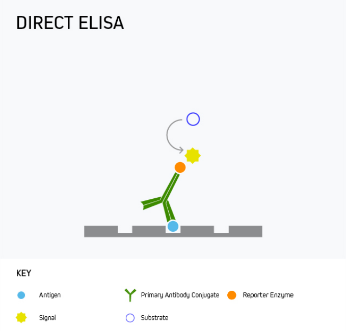 A direct ELISA offers the advantage of being quick and easy to run since it involves little more than coating the microplate with the analyte, blocking, and then adding the detection antibody. However, it has only limited sensitivity as there is no amplification from a secondary antibody, meaning alternative formats are often preferred.