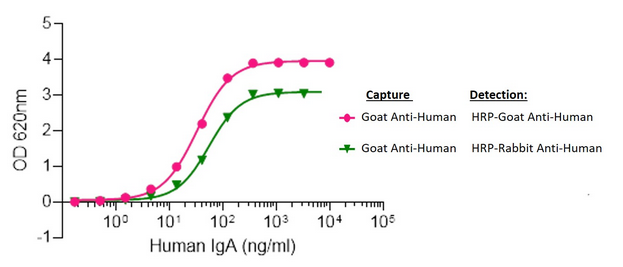 Elisa plates were coated with AffiniPure Goat Anti-Human Serum IgA, α chain specific (109-005-011). After blocking with Bovine Serum Albumin (IgG-Free, Protease-Free) (001-000-162), ChromPure Human Serum IgA, whole molecule (009-000-011) was then titrated across successive wells and the non-binding fraction was washed off. Captured IgA was detected with either Peroxidase AffiniPure Goat Anti-Human Serum IgA, α chain specific (109-035-011) or Peroxidase AffiniPure Rabbit Anti-Human Serum IgA, α chain specific (309-035-011) diluted 1:20,000 in assay buffer. Both Goat and Rabbit antibodies displayed similar limits of detection and high signal to noise.