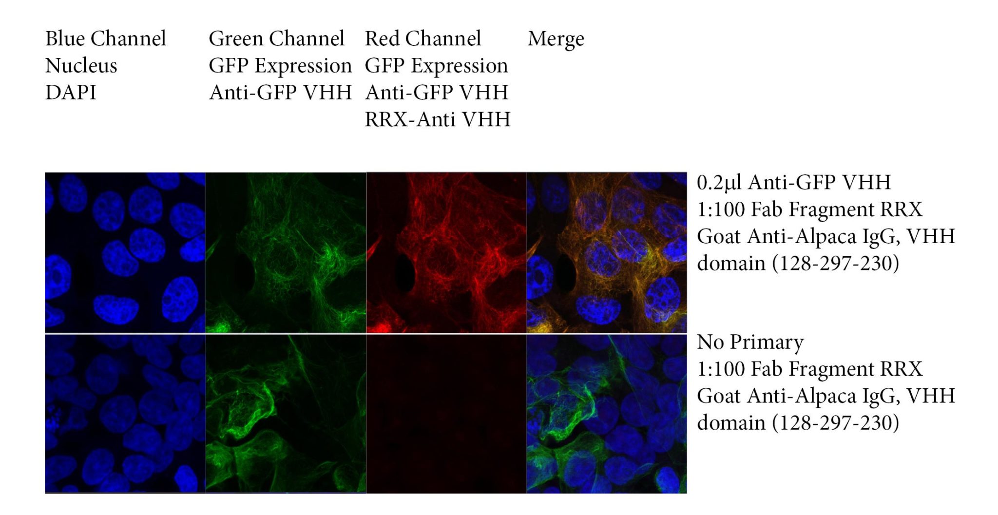 The following experiment shows the detection of GFP in transfected HEK 293T cells with a recombinant Anti-GFP nanobody in combination with JIR’s monovalent Rhodamine Red™‑X- Fab Fragment Goat Anti-Alpaca IgG, VHH domain antibody (128‑297‑230).