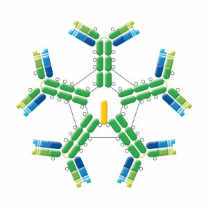 IgM exists in 2 forms. Monomeric IgM is found on B cells, functioning as a B cell receptor (BCR). Pentamers (hexamers have also been found) that consist of 5 identical antibody units are found in circulation. These pentamers confer a high overall avidity from 10 binding sites, making IgM a potent complement activating antibody. IgM has an extra domain on the mu chain (CH4) and contains a J chain which is essential for the active transport of IgM through epithelial cells (see IgA). IgM does not cross the placenta, but is the first Ig to be made by the fetus and the first Ig to be made after immunization or exposure to antigen. Elevated levels of IgM may indicate recent infection or exposure to antigen.