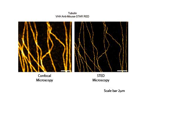 Although JIR AffiniPure VHH™ are available conjugated to a wide range of fluorescent dye conjugates, including AlexaFluor®, SRM techniques such as STED (Stimulated Emission Depletion Microscopy) and STORM (Stochastic Optical Reconstruction Microscopy) need dyes with specialized spectral characteristics and behaviors. Abberior is well known for the superior chemistry of its dyes and their commitment to providing exceptionally bright dyes for SRM imaging.
