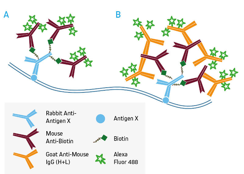 Monoclonal Mouse Anti-Biotin, Anti-Fluorescein and Anti-Digoxin are available in a wide range of conjugate options for direct detection of their target molecules, which are commonly used as tags on proteins and nucleic acids. If signal amplification is desired, these antibodies can be used unconjugated, followed by conjugated anti-mouse IgG (H+L) (see examples below using Mouse Anti-Biotin).