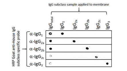The example below illustrates the performance of the Goat Anti-Mouse subclass specific antibodies in a dot blot experiment. In each case, the subclass specific antibody only recognizes its specific target in the presence of additionally blotted subclasses.
