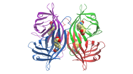 Streptavidin is a tetrameric bacterial protein isolated from Streptomyces avidinii providing 4 high-affinity biotin binding sites (Figure 1). Comparisons of apo and liganded streptavidin crystal structures by Weber et al. (1989) showed that affinity is conferred by multiple hydrogen bonds and van der Waals interactions, which in conjunction with polypeptide loops confine the biotin in streptavidin’s interior. The result is one of the strongest non-covalent bonds found in nature, with a femtomolar dissociation constant (Kd ~10-15). Unlike egg-white avidin, which has a net positive charge at neutral pH and contains about 7% carbohydrate, streptavidin has almost no net charge at neutral pH, does not contain carbohydrate, and exhibits lower non-specific background.