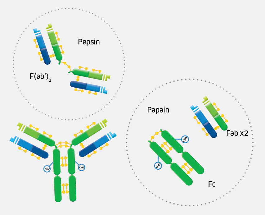 ChromPure proteins are prepared by a variety of methods, including ion-exchange, gel-filtration, hydrophobic, dye-ligand, metal-affinity, Protein A, and immunoaffinity chromatographies. Enzyme digestion is used to generate F(ab’)2 (pepsin), and Fab and Fc (papain) fragments from highly purified whole molecules.