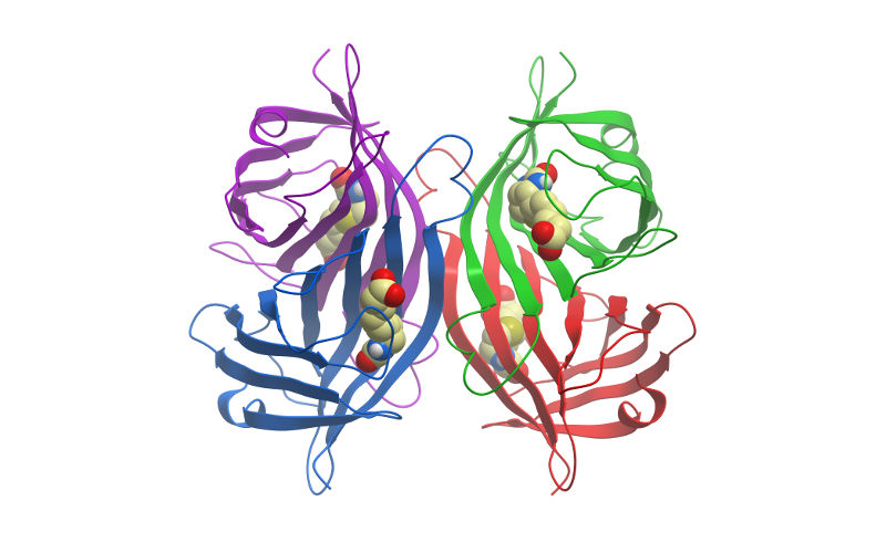 Streptavidin is a tetrameric bacterial protein isolated from Streptomyces avidinii providing 4 high-affinity biotin binding sites (Figure 1). Comparisons of apo and liganded streptavidin crystal structures by Weber et al. (1989) showed that affinity is conferred by multiple hydrogen bonds and van der Waals interactions, which in conjunction with polypeptide loops confine the biotin in streptavidin’s interior. The result is one of the strongest non-covalent bonds found in nature, with a femtomolar dissociation constant (Kd ~10-15). Unlike egg-white avidin, which has a net positive charge at neutral pH and contains about 7% carbohydrate, streptavidin has almost no net charge at neutral pH, does not contain carbohydrate, and exhibits lower non-specific background.
