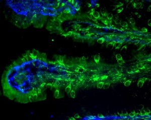 Jejunum villi neuroendocrine cells, Mouse anti-Synaptophysin + Cy™2 Donkey anti-Mouse (715-225-150 green). Basement membranes, Goat anti-collagen IV + Cy™5 Donkey anti-Goat (705-175-147 blue).