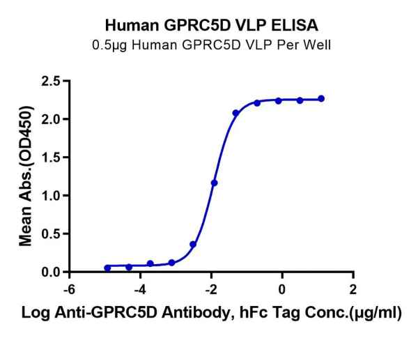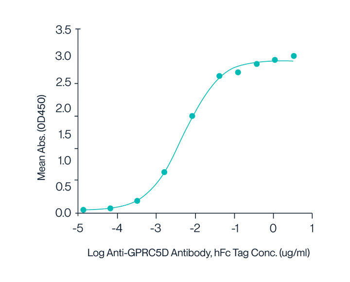 Figure 7. Human GPRC5D Nanodisc with His Tag was immobilized at 2 µg/ml (100 µl/well) on the plate. The dose-response curve for the Anti-GPRC5D Antibody with hFc Tag was generated, with an EC50 of 4.9 ng/ml as determined by ELISA.