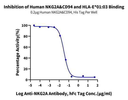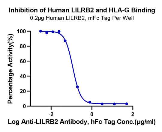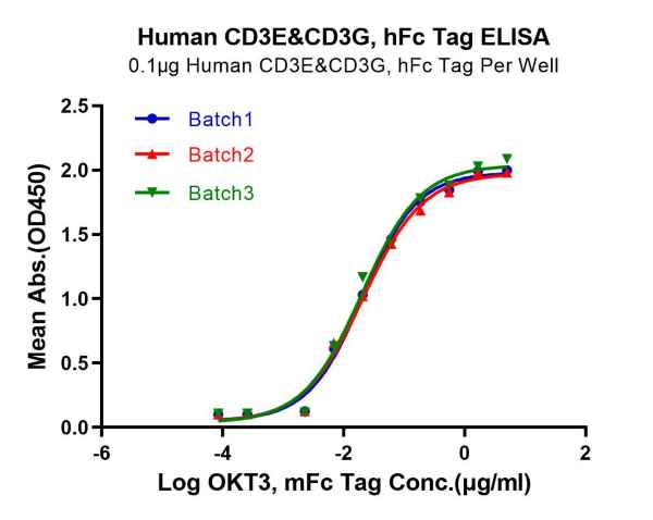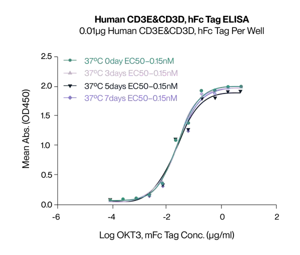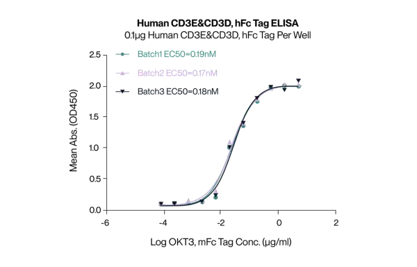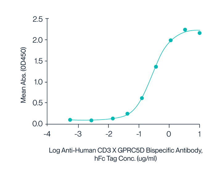 Figure 8. Human CD3E&CD3D, with a His Tag, was immobilized on the plate at a concentration of 2 μg/mL (100 μL/well). Serial dilutions of the Anti-Human CD3×GPRC5D bispecific antibody, with an hFc Tag, were then added, followed by the addition of biotinylated Human GPRC5D Nanodisc, with a His Tag, at 5 μg/mL. Detection was performed using HRP-conjugated streptavidin, and the EC50 was determined to be 0.28 μg/mL by ELISA.