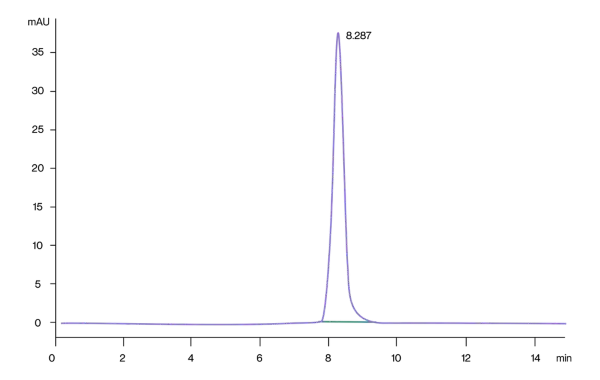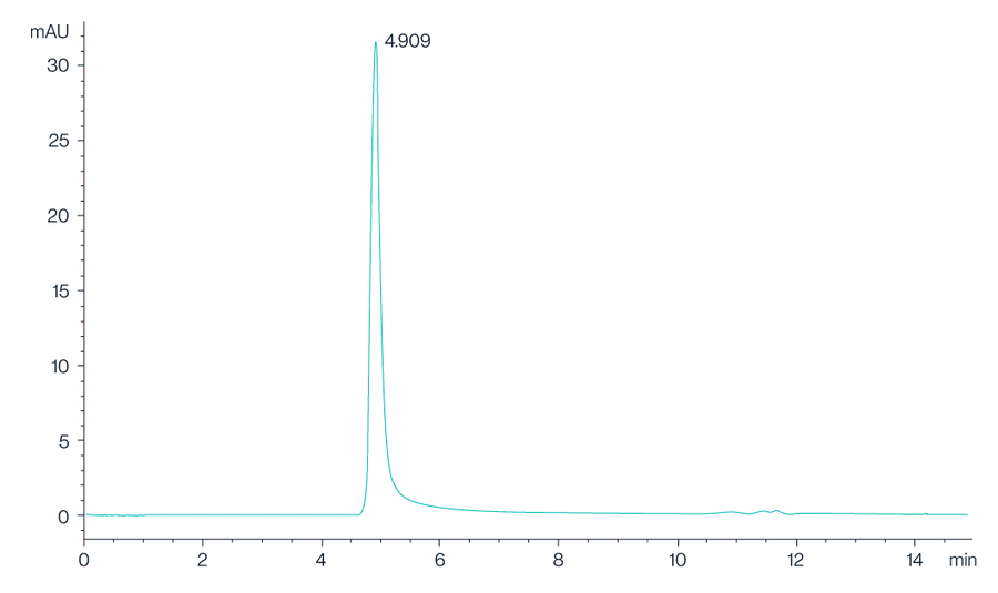 Figure 2. The chromatogram shows the high-performance liquid chromatography (HPLC) profile of Claudin 18.2 VLPs, with a prominent peak observed at 4.909 minutes, indicating the retention time of the Claudin 18.2 protein. The sharp and well-defined peak suggests a high purity and consistency of the VLP preparation.