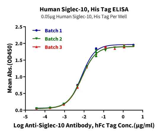 Figure 7. Verified by ELISA, recombinant Human Trop-2 (left) and Siglec-10 (right) proteins exhibit good batch-to-batch stability.