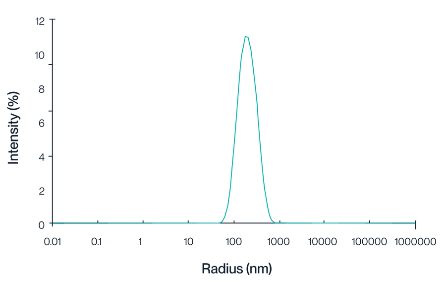 Figure 1. This graph illustrates the intensity distribution of Claudin 18.2 VLPs as measured by dynamic light scattering (DLS). The peak centered at approximately 150 nm indicates a homogeneous population of VLPs, reflecting the consistent size and quality of the particles.