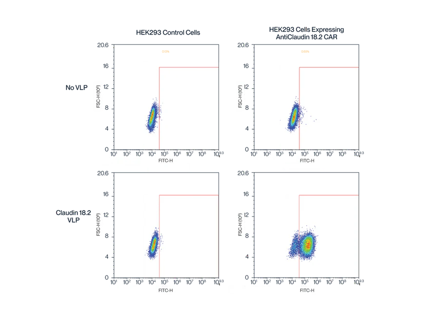 Figure 5. Flow cytometry data demonstrates the binding specificity and quantification of Claudin 18.2 displayed on VLPs. The top panels show the results from HEK293 control cells, while the bottom panels show the results from anti-Cld18.2 CAR-expressing HEK293 cells. The presence of Cld18.2 VLPs results in a significant shift in the fluorescence signal in anti-Cld18.2 CAR-expressing cells, indicating successful detection and quantification of Cld18.2 on VLPs. This validates the high-quality expression and bioactivity of the Claudin 18.2 VLPs.