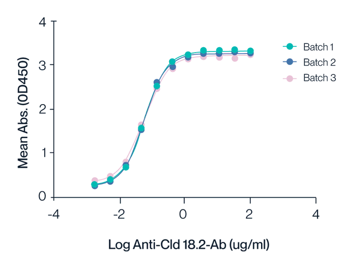 Figure 3. ELISA assay shows the binding activity of Claudin 18.2 VLPs to anti-Claudin 18.2 antibodies across three different production batches. The consistent curves for Batches 1, 2, and 3 highlight the reproducibility and stability of the VLP preparations. The half-maximal effective concentration (EC50) is determined to be 0.1 nM, indicating high affinity and robust interaction between Claudin 18.2 VLPs and the specific antibodies.