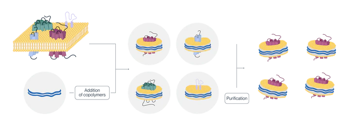 Nanodiscs are membrane-like structures composed of phospholipids and membrane scaffold molecules, which are typically synthetic copolymers or membrane scaffold proteins. We use a proprietary amphipathic copolymer to enable membrane protein stabilization & solubilization without the use of detergents.