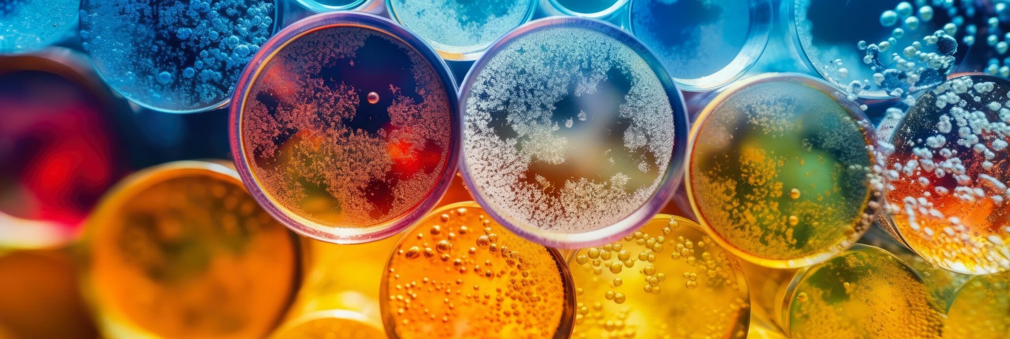abstract panoramic wallpaper of a petri dish cultivating colorful bacterial colonies, symbolizing microbiology